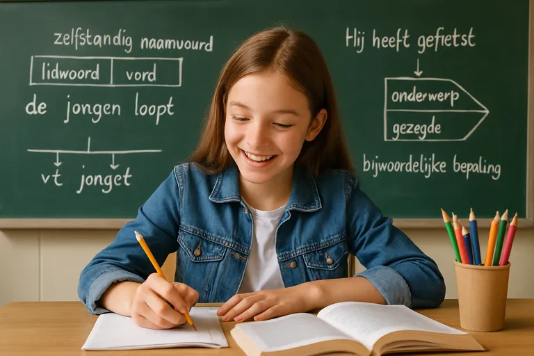 Grammatica in groep 7 draait om de bouwstenen van zinnen en de regels die je helpen correct te schrijven en spreken. Je verdiept je in woordsoorten, zoals zelfstandige naamwoorden (dingen en personen), bijvoeglijke naamwoorden (eigenschappen), werkwoorden (doen-woorden), voornaamwoorden (ik, jij, hem), voorzetsels (op, in, naast) en voegwoorden (maar, want, omdat). Je leert zinnen ontleden: je vindt de persoonsvorm (het werkwoord dat van tijd kan veranderen), het onderwerp (wie of wat iets doet), het gezegde (wat er gebeurt) en soms ook het lijdend en meewerkend voorwerp. Werkwoordspelling krijgt extra aandacht: je oefent de tegenwoordige tijd (ik loop, hij loopt), de verleden tijd (ik liep, hij fietste) en het voltooid deelwoord (gelopen, gefietst).